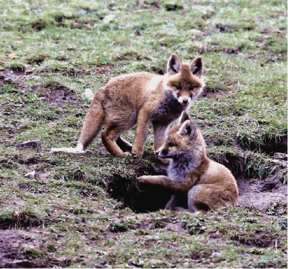 藍天白云,微風輕漾;草地碧綠,鳥語花香。大自然的美景圖正在小赤狐的家園四周徐徐展開。在膽大的小赤狐的叫喚聲里,躲在洞內(nèi)的另外兩只小赤狐也壯著膽子探出頭來。不一會兒,它們習慣了周圍的環(huán)境,三只小赤狐在離洞口5米遠的范圍內(nèi)嬉戲玩耍著。它們時而跳躍,時而奔跑,展現(xiàn)出本能的捕獵動作。稍大一點的小赤狐騎在小一點赤狐的背上嬉戲玩耍,小赤狐也不示弱,奮力反擊,猶如兒童打鬧,其樂無窮。那烏黑溜圓的眼睛彎了又彎,毛茸茸的尾巴高高地翹起,身體嬌小,惹人喜愛,讓人看了會產(chǎn)生想上去抱一抱、摸一摸小赤狐身軀的念頭。