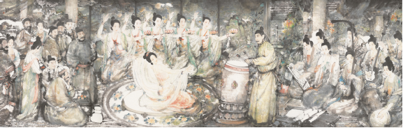 劍器舞也有著悠久傳統(tǒng),早在春秋戰(zhàn)國時代,孔子的學(xué)生子路,戎裝見孔子,曾拔劍起舞。學(xué)生拜見老師舞劍,當(dāng)然只是表演技藝,是對老師致敬的意思。湖北隨縣戰(zhàn)國初期曾侯乙墓出土的鴛鴦盒上的樂舞圖案中,鼓旁的舞者腰間掛著短劍,說明劍舞可能是當(dāng)時頗為流行的一種舞蹈形式。楚漢相爭時,劉邦、項羽宴于鴻門,項莊說:“君王與沛公飲,軍中無以為樂,請以劍舞?!表椨鸨硎就?,于是項莊拔劍起舞,逐漸靠近劉邦,企圖借機殺死劉邦,在場的項伯見劉邦危急,也以劍伴舞,保護劉邦不被項莊殺害。這個故事表明,當(dāng)時筵宴中有舞劍作為助興表演的風(fēng)俗。唐代,杜甫作《故武衛(wèi)將軍挽歌三首》,有“舞劍過人絕”句??梢姰?dāng)時許多人會舞劍,而且各有絕招。公孫大娘最為擅長的《劍器舞》,是《裴將軍滿堂勢》。杜甫曾觀其舞,并寫了《觀公孫大娘弟子舞劍器行》一詩,觀者如山,可見此舞技巧之高。