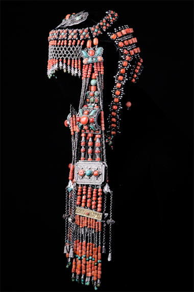 清代烏拉特蒙古族婦女頭飾, 具有著豐富的民俗思想和宗教思想。如頭飾中鑲嵌的珊瑚, 有的雕成日形, 有的雕成月形, 亦有山形、火形等等, 這與蒙古族自古以來的薩滿教崇拜有關(guān)。又如銀托座做成蓮花形、金鋼杵形或法輪形, 這又受喇嘛教的深刻影響。再如飾物做成魚形、蝙蝠形、壽字、喜字等等,則是中原漢族常用的吉祥圖案, 是漢文化滲入的反映。復(fù)如飾物上的珠子多為奇數(shù), 有三、九或是三、九的倍數(shù)等, 這是蒙古族長期形成的民族吉數(shù), 以九為大。整個頭飾就是一部民族思想觀念的綜匯大成。