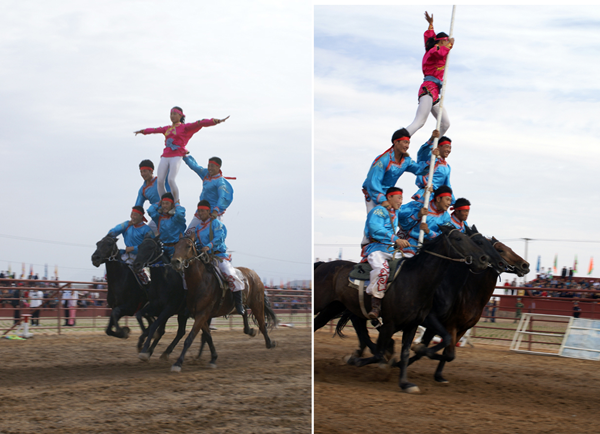 蒙古族的馬術(shù)表演非常精彩,有很多項目?!翱缭秸系K”是在運動場跑道上每隔幾十米設(shè)置一個高1米的跨欄。跑道終端立著一個直徑約2米的火圈,矯健的坐騎從起跑線踏蹄起跑,越過跨欄,鉆過火圈直達終點。“乘馬斬劈”是在200-250米的距離之間樹起十幾個目標(biāo)。騎手們手持馬刀,疾馳如飛,經(jīng)過一個個目標(biāo)時舉刀劈砍,刀起標(biāo)落。“馬上技巧”是由運動員們在飛馳的馬背上做出各種造型動作。運動員一般八九歲就要在馬術(shù)隊接受嚴(yán)格的訓(xùn)練。技巧表演可分單項和多項,其中又包括單人單馬、單人雙馬、雙人雙馬和多人多馬。一匹飛奔的馬經(jīng)過騎手身邊,騎手可以突然抓住馬鬃翻身上馬,又會突然下馬腳尖點地再躍上馬背。其他技巧還有在馬背上“空翻倒立”“側(cè)方隱蔽”“樓里藏身”以及驚險的“馬上疊羅漢”等表演【如圖,劉軍攝影,編者修剪合成兩圖】。