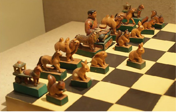 蒙古象棋棋盤,淺色的叫白格,深色的叫黑格,棋子也分白黑兩種,共32個,雙方各有一王、一帥、雙車、雙象、雙馬和八個小兵。與國際象棋不同的是,蒙古象棋把象刻成了駱駝,把兵刻成了獵狗的形象,增添了草原游牧生活特色。在民間,玩蒙古象棋仍然是古波斯的走法,也就是國際象棋原來的走法。但明朝永樂年間的《芝仙集》有關(guān)蒙古象棋的記載表明,現(xiàn)代蒙古象棋的走法早在14世紀(jì)末就已定型。這比現(xiàn)代國際象棋的定型要早100多年。