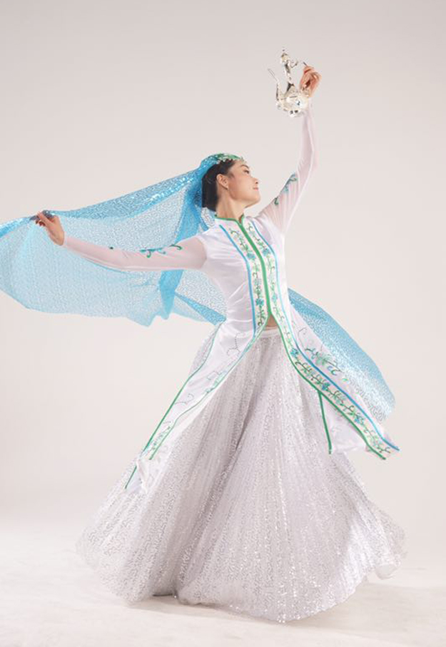 “湯瓶舞”流傳于寧夏回族自治區(qū)。舞者持白毛巾為道具,表現(xiàn)伊斯蘭教禮拜前用“湯瓶”(壺)盛水凈身之習(xí)俗。舞蹈中還常出現(xiàn)模擬“湯瓶”的形象,故有此名。舞蹈有“擦身”“搓背”以及揮舞毛巾互相抽打、嘻戲等動(dòng)作(圖為手持湯瓶道具,表演回族舞蹈, 舞者娟子本人提供)。