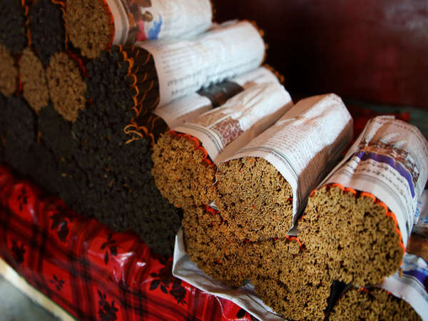 當(dāng)?shù)厝私榻B說:制作藏香的原材料和制作工序要求極其苛刻。由于藏香最主要的用途是用在宗教禮儀上,所以在制作過程中要求一切都要以圣潔為主,否則會(huì)被視為是對(duì)神靈的不敬。傳統(tǒng)的藏香原材料繁多而復(fù)雜,一般是柏樹樹干為主料,再以藏紅花、麝香、白檀香、紅檀香、紫檀香、沉香、豆蔻、穿山甲、甘菘、冰片、沒藥等幾十種香料按適當(dāng)比例配合主料搓揉而成。據(jù)了解,用于制作藏香的主料柏樹干,在吞巴村這樣高海拔的地方并不生長,從古至今,村民都要從400多公里外的林芝縣運(yùn)過來了,而制作藏香的部分輔料甚至要從印度引進(jìn)。