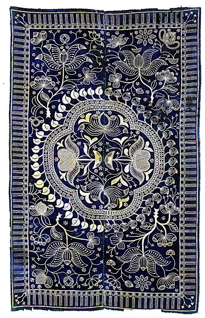 苗族蠟染歷史悠久,很多地方都流行有《蠟染歌》(古歌),敘述蠟染的起源。早在秦漢時代,苗族的先民就已經(jīng)掌握了蠟染技術(shù),據(jù)《貴州通志》記載:“用蠟繪花于布而染之,既去蠟,則花紋如繪”,這種蠟染布曾被稱為“闌干斑布”。宋代五溪地區(qū)的“點蠟?!?蠟染)已很盛行。明、清時代,黔中一帶苗族也多用蠟染衣料。民國年間,蠟染盛行于湘西、貴州、云南、川南的大部分苗族中,而以貴州的丹寨、安順、郎岱(今六枝)、普定、惠水等地技藝最高。大多數(shù)地區(qū)都將蠟染成品作衣飾,湘西地區(qū)則用作床單、枕巾等。