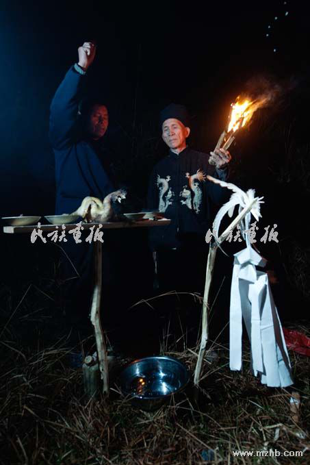 到招龍儀式活動點時,已是凌晨五點半,我們所在的位置是一個山腰,有一個小壩子。我發(fā)現(xiàn)參加儀式的只有十二三個人,就好奇地問:“為什么只來十多個人?”原來這些人是選出來的代表,該村有7個村民小組,共203戶,有980多人口,每次招龍大喜時,要從村民中推選出12位作為招龍代表,從頭到尾主持一切事務(wù)。說話間,村里人就開始忙著生火,或準(zhǔn)備各項招龍工作。他們用木板支起一個擺放祭品的臺板,擺上祭品。接著,在招龍師傅的主持下,儀式正式開始。第一個程序是“喊白虎龍”,苗家稱為“共階夸羊捌”,師傅拿著一個白公雞,進行一番念誦后宰殺掉,等雞煮熟后再擺上祭臺。