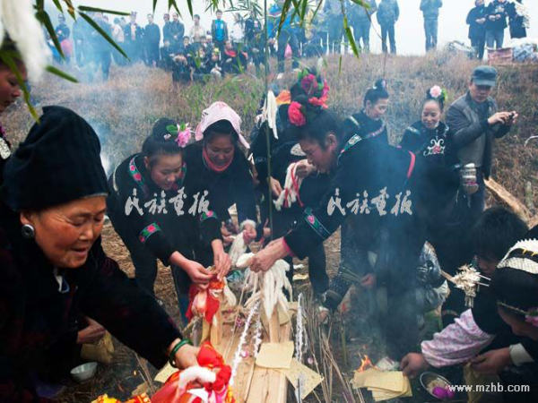 招完白虎龍后,天已大亮,這時村里人抬著一頭豬上來了,村民把龍橋龍凳做好,安放在壩子中央。接下來,儀式進入招龍程序。在龍橋龍凳的前方,擺上煮熟的豬頭、豬尾、豬腳和心肝、12坨豬肉、12碗甜酒、12碗糯米飯等祭品。12位招龍代表整整齊齊地站在龍橋龍凳的后方,燒完香紙后,由師傅開念招龍詞,把四面八方的大河小溪、大坡小坡、大嶺小嶺、大梁小梁、大橋小路、寨邊古樹的龍魂全喊到招龍場地來。傳說龍是治水的,苗族人崇拜龍,把龍招進來是為了保佑全村男女老少百年長壽,家家戶戶發(fā)子發(fā)孫,解災(zāi)脫難,風(fēng)調(diào)雨順,五谷豐登,喂牛牛大,養(yǎng)豬豬肥,養(yǎng)雞雞發(fā),順順利利,平平安安。師傅念完后,與招龍代表把12杯酒喝完,表示程序完畢。不久,全村男女老少三三兩兩都來到了山上,許多婦女帶著祭品燒香燒紙求子求孫,龍橋龍凳四周擠滿了人,香火彌漫整個山坡。