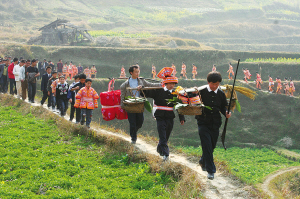 過去,如果新婚夫妻兩家相距較遠(yuǎn),那么新郎新娘整天甚至兩三天都要在路上行走。不過,姑娘、小伙兒收獲了甜蜜的愛情,這點(diǎn)付出也是值得的?,F(xiàn)在各村都通車了,這甜蜜也就來得不必那么辛苦了。
