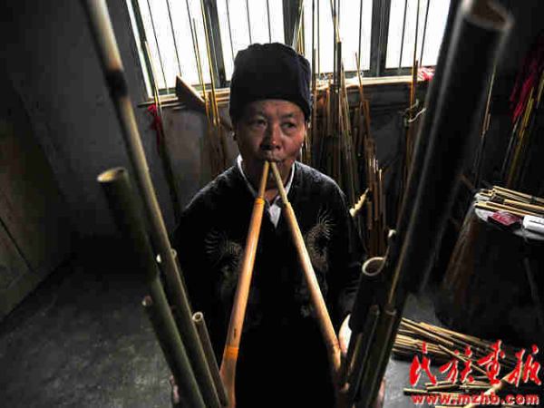 莫師傅在對(duì)兩個(gè)蘆笙進(jìn)行高低音的和諧調(diào)試