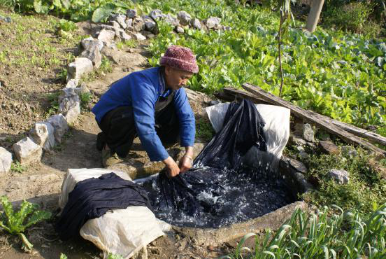 從前壯族鄉(xiāng)村,普遍掌握制作藍靛及印染方法。一般置一大缸,將藍草放入浸泡,加石灰使之分解、發(fā)酵,經(jīng)過化學(xué)變化,而后濾去殘渣,蒸發(fā)水分,凝成糊狀藍色染料。其間需不斷攪動,使色素充分化解?!懊康宀萘俳?,造成一百斤之靛為佳?!币虍a(chǎn)量較多,遠(yuǎn)銷廣東。浸染時,將適量靛糊化于染缸中,同時將雞血藤搗碎加入。布要反復(fù)浸泡多次,晾泡結(jié)合,直到染為深藍色。其間雞血藤釋放出一種紫紅色的植物膠,將藍靛色素粘在纖維上,是色素耐水耐腐耐紫外線,不易褪色,并有若隱若現(xiàn)的亮點,結(jié)實美觀。這個過程,運用了化學(xué)分解法。