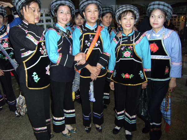 西南地區(qū)的服飾分布地區(qū)包括貴州省黔南布依族苗族自治州羅甸,黔西南州望謨、冊亨、貞豐、安龍、興義、興仁、安順市的鎮(zhèn)寧、關嶺、紫云三縣的南部以及云南省羅平等縣(市),基本上都屬于布依語第一土語區(qū)。這個地區(qū)婦女普遍穿大襟衣、長褲腳。衣服的盤肩、袖口、襟沿鑲有蘭干。褲腳為大褶邊,或藍色褲腳鑲一截青布和蘭干。衣服的長短和褲腳的大小,各地區(qū)都不相同。冊亨一帶衣服較短,褲腳短小,包花格長帕,胸頸掛彩珠項圈,手套玉石或骨制手鐲;望謨一帶青年婦女把花格帕折疊后纏戴;貞豐一帶的衣服較長,褲腳不折邊,青年和老年婦女基本相同,但青年婦女包的花帕形狀如牛角(人稱“牛角帕”);靠近北部地區(qū),衣褲都較長,而且不鑲蘭干,衣褲和帕子多為青色;安龍、興義一帶則多包白帕,衣褲亦不鑲蘭干;西南一帶地區(qū)衣褲已漸不鑲蘭干,但還穿自織的土布衣服,頭上還包花格帕,一些地區(qū)與漢族婦女裝束完全一樣了。