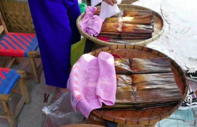 褡褳粑是布依族人民喜愛的傳統(tǒng)食品,因其如褡褳袋而得名。每逢農(nóng)歷七月十五日(中元節(jié)),布衣族人民均普遍制作褡褳粑,作為祭祀祖先的供品。相傳兩千多年前,祭祖是用當?shù)厥a(chǎn)的芭蕉果和普通糍粑,后來發(fā)展為用芭蕉和糯米蒸熟,加上紅糖,制成甜味糍粑。又經(jīng)過多次改進才形成現(xiàn)在的褡褳粑。如今,除七月十五日以外,逢年過節(jié),宴客,走親訪友,也要制作褡褳粑。蒸熟后的褡褳粑呈長方形,色澤醬黃,香甜細膩,具有芭蕉果和芭蕉葉的特殊香味。熱吃軟滑細膩,冷吃清涼甜潤,烙食香脆。