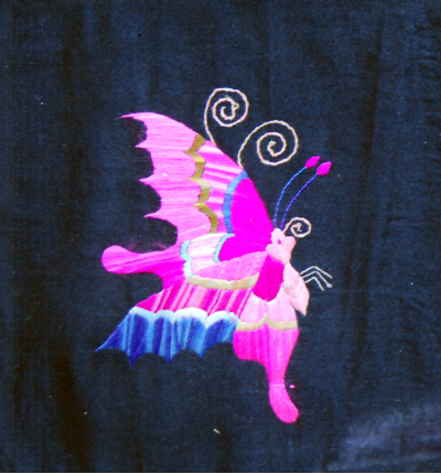 5.拽蜂,是在面料平底上繡制出立體的蝴蝶。由于繡工精細,找不出怎樣連接繡制的地方,好像從布地子上拽出來的蜂,“拽蜂”之得名,古代稱蝴蝶為蜂。