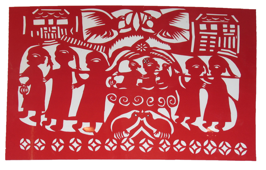其實,這樣一種民間工藝,早在清代,就已堂而皇之地登上了朝廷大雅之堂。如皇帝舉行婚禮作洞房的神寧宮,墻壁就按滿族習(xí)俗裱紙,四角貼著雙喜字剪紙角花,頂棚中心貼著龍鳳團(tuán)花剪紙。在宮殿兩旁的過道壁上也貼有角花。據(jù)說有人用紙剪成有鹿、鶴、松的“六合春”圖案,加以彩繪,貼于朝服覲見慈禧太后,連她都以為是繡出來的。