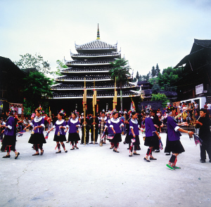 侗寨鼓樓前的表演。侗家把鼓樓當(dāng)做遮蔭樹(shù),既是侗寨的象征,也是氏族的標(biāo)志。因此,所有鼓樓都是全寨人集資、出力興建的,大一點(diǎn)的村寨按居住范圍會(huì)建幾座鼓樓。