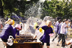 “扁水”是當(dāng)?shù)胤窖?,為戲水、潑水之意?!氨馑笨駳g節(jié)源于侗族“為也”習(xí)俗,為做客之意,指村寨之間村民們的互相訪問,是當(dāng)?shù)匾?guī)模最大的社交和娛樂活動?!盀橐病睍r,當(dāng)?shù)囟弊迦罕姂蛩?、潑水狂歡,久而久之就形成了“扁水”狂歡節(jié)。