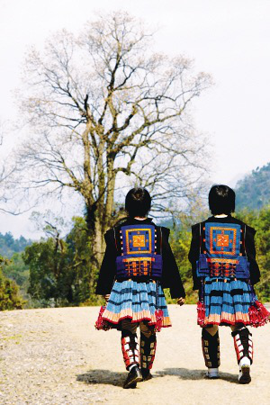 白褲瑤女人體態(tài)婀娜。這婀娜既來自于她們風(fēng)擺楊柳般的百褶裙,也來自身上前后兩片的夏衣。夏衣,黑色的調(diào)子,沒領(lǐng),沒袖,前面是一塊和肩膀?qū)挾认嗟鹊恼叫嗡夭?,后面則是用蠶絲布來制作的裙邊土布,上面繪滿了蠟染和花繡圖案。用漿染土布縫制成的百褶裙上,布滿了手繪而成的彩色圖案。其最復(fù)雜的工序,一是借粘膏樹汁憑空勾畫,二是用花線依著粘膏樹汁描過的隱約印痕,一點(diǎn)一點(diǎn)地挑繡出彩色圖紋來。做好一條裙子,往往需要花上女人們半年的時間。