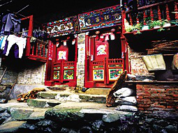 狹長式的房屋大都建在深山里幾十戶大小的村寨。面闊一間并開正門,室內(nèi)隔間向縱深排列,從正門到后門有7道門之多。正門是大門也是第一道門,是家族的門面,被視為招財(cái)進(jìn)寶和迎接貴客之門。對(duì)開門扇高大厚實(shí),門檻上又設(shè)兩扇雕刻彩繪的矮門,天熱開大門通風(fēng)時(shí),可以防止禽畜入戶。大門兩側(cè)掛有木刻大字對(duì)聯(lián),大門墻面的屋檐下則畫有七彩畫卷。