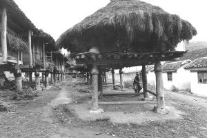 圓倉(cāng)底部用4根木柱支起,4根木柱之間距離相等,成正四方形,圓柱底部用木板鑲嚴(yán)實(shí),以避免糧食下漏、透風(fēng)、受潮。建于村旁戶外的圓倉(cāng),一般都具有防水、防鼠、防潮等多種功用。