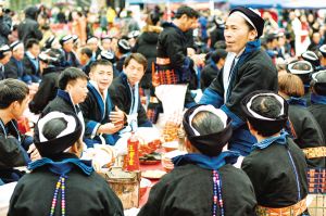 每逢重要節(jié)日,白褲瑤群眾都有舉辦長席宴的習(xí)俗。以前,芭蕉葉當(dāng)作盤子,芭芒干折成筷子,一個飯團、一塊牛肉,再加一碗酒,就是長席宴的全部?,F(xiàn)在改變了很多,但不變的是白褲瑤自然、和諧、平等的美德。2019年2月拍攝。