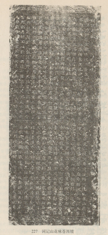 白文碑刻。明楊黼作。景泰元年(1450年)立,原嵌于大理縣作邑鄉(xiāng)慶洞莊圣元寺偏殿前廳北壁,后移至大理縣文化館。碑文14行,陰文正體,從右到左直行書寫。首行為題,其余正文,共13行,每行40字,只第9行41字,末行39字。全詩20節(jié),每兩節(jié)為一聯(lián),共10聯(lián)。前4聯(lián)詠蒼山洱海的自然景色和地勢名勝,后6聯(lián)抒作者之情感。以白語吟誦,優(yōu)美動聽。這是目前保存最為完好的一塊白文碑。傅懋勣、肖雷南在40年代曾根據(jù)郭純?nèi)实淖x音注解此碑,有油印本。石鐘健、楊燦然、徐嘉瑞亦對此碑加以研究。1957年,徐琳、趙衍蓀以郭純?nèi)首x音為本,用國際音標(biāo)記音,并加翻譯。《民族語文》1 980年第3期載有釋讀文章。