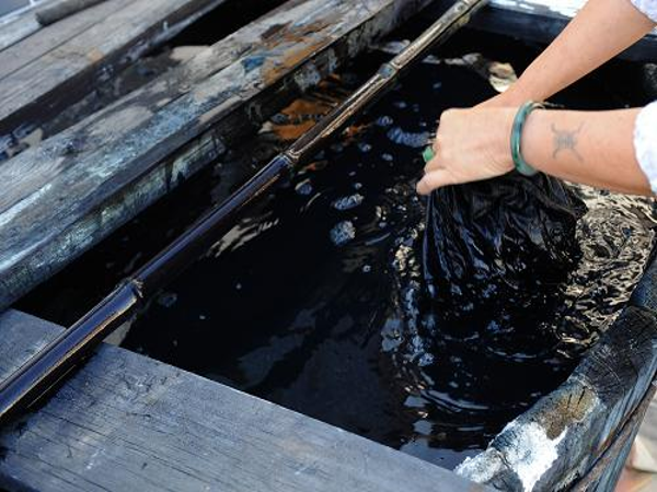 白族扎染的染料來自蒼山上生長的寥藍(lán)、板藍(lán)根、艾蒿等天然植物。用得最多的是板藍(lán)根,以前用來染布的板藍(lán)根都是山上野生的,多年生草本,開粉色小花,后來用量大了,染布的人家就在山上自己種植,好的可長到半人高,每年三四月間收割下來,在松木桶中漚制成染料。