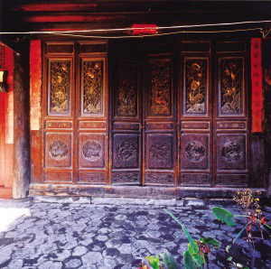云南大理市綠桃村“三坊一照壁”民居堂屋六扇木門的雕刻。院內(nèi)廈廊和正房的格子門,一般由6扇組成,每扇門又分隔成5塊木板,每塊木板都是透雕和浮雕相結(jié)合的木雕。分別雕刻著“雙鳳朝陽、二龍搶寶、八仙過海、喜鵲登梅、漁樵耕讀、六合同春”的吉祥圖案,刀法嫻熟,輪廓清晰,形象生動(dòng),一個(gè)院落就是一個(gè)木雕藝術(shù)畫廊。此外,窗上有通透的花格,下部檻墻做成木質(zhì)裙板。