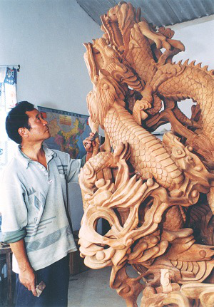 今年54歲的李元生,以雕龍而遠(yuǎn)近聞名。早在上個(gè)世紀(jì)80年代初,他創(chuàng)作的第一件根(木)雕作品《困龍也有上天時(shí)》,便被一位游客購買收藏。在近20年的時(shí)間里,一些常人眼里只能當(dāng)柴燒的樹根,在他獨(dú)特的構(gòu)思和飛舞的刻刀中,變成了上百件大小不一的富有生命力的根(木)雕作品。其中的代表作有:《九龍傳說》、《送子觀音》、《長壽九千年》、《金龍獻(xiàn)寶》、《哪吒鬧海》、《1999——人與自然》等。這些作品,不少被省內(nèi)外的單位和個(gè)人作為珍品收藏。