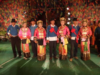 主婚人念完祝詞以后,新郎、新娘各在桌上揪下一團糯米飯,蘸點米酒、食鹽、舂鹽捧、芭蕉后擺在桌前。主婚人拿起一條長長的白線,從左至右纏在新娘、新郎的肩背,將白線兩端搭在“茂歡”之上,表示將一對新人的心拴在一起。然后再拿兩縷白線,分別纏在新郎、新娘的手腕上,祝愿新婚夫婦百年好合,無災(zāi)無難。在座的長者也各拿兩縷白線,分別拴在新郎、新娘手上,邊拴線,邊念些祝愿詞。拴完線后,婚儀基本結(jié)束,婚宴開始,新郎新娘向賓客敬酒致意。