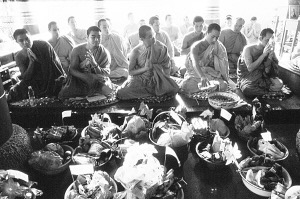 早晨8點多鐘,隨著緬寺大佛爺都比罕念誦起那古老的滴水詞經(jīng),賧奉儀式開始了。我隨玉波一家坐在從家里帶來的涼席上。緬寺里已擺放不下人們送來賧奉的物品,只好放在緬寺的周圍。人們用一根白線拴系著物品連著緬寺,以示并沒有遠離緬寺和佛祖。