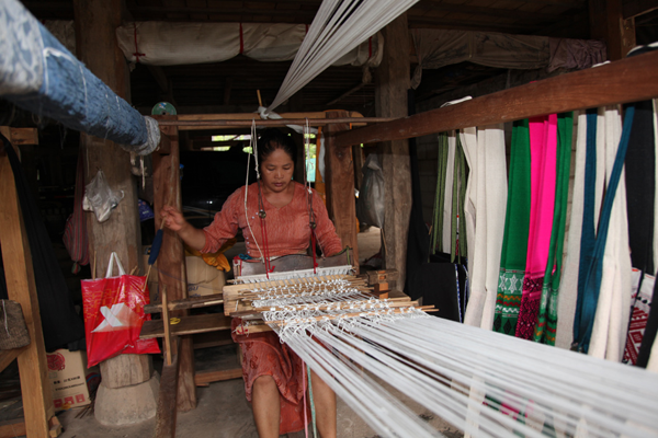 傣錦具有嚴格的制作工序。第一道工序為上漿。傣錦所選用的材料為天然麻棉,上漿可以讓麻棉線的韌性加強,不會起毛,這一步對以后織傣錦的過程有非常重要的影響。先將麻棉用專門調制好的米漿浸泡一天兩夜,再放到蒸籠蒸,蒸的時侯要注意不斷小心地翻動,以保證米漿完全均勻地浸入棉紗,令到棉線的粗細一致。第二步是曬棉紗。即把蒸好的棉紗放在太陽底下暴曬,在曬的過程中需要由專人隨時檢查,把結在一起的棉紗一根根分開來,這樣在紡線的時侯棉線才不會因為線粘在一起而斷掉。最后把曬好的線繞成線團。第三步是拉經線。拉經線也是傣族織錦中非常重要的一道工序。在拉線的時候,所需要的場地非常大,因為線一拉一般都有八九十米長,為保持所有的線在拉的時候不會亂掉,只能在沒有太大的風的天氣才能進行,讓整個傣錦制作過程又增加了難度。在拉經線的整個過程,都必須由有經驗的老藝人來組織,打樁,計算經線的長度,而且必須控制好在拉經線的過程中棉線的松緊度。否則在織傣錦的時侯會有花紋傾斜,圖案錯亂等問題。整個拉經線的過程需要由7-8個老藝人一起來完成。第四步是編花和上機。傣錦是一種古老的手工紡織工藝,圖案的設計是通過熟練的紡織技巧創(chuàng)造出來的,多是單色面,用緯線起花,對花紋的組織非常嚴謹,織造時傣族婦女將花紋用一根根細繩系在“紋板”(花木)上,用腳蹬手抬的動作使經緯形成上下兩層后開始投緯,如此反復循環(huán)便可織成十分漂亮的傣錦。設計一幅傣錦,需幾百乃至上千根細繩在“紋板”上表現出來,倘若結錯一根細線,就會使整幅傣錦圖案錯亂,可見傣錦的工藝要求極高。