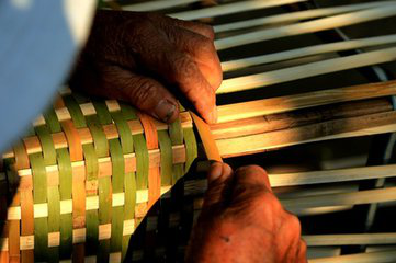 傣族竹編工藝是傣族的傳統(tǒng)工藝美術(shù)形式,歷史悠久,造型古樸,美觀實(shí)用。由于我國傣族主要聚居在云南等地的熱帶、亞熱帶地區(qū),居住地周圍多與竹子為伴,在生產(chǎn)生活中就地取材,形成了傣族世代相傳的主編技藝,具有著鮮明的民族特色。傣族竹編選材主要采用藤竹、粘竹、大黃竹以及巨龍竹等編織,將竹絲、篾片挑壓交織,被挑壓的篾為“經(jīng)”,編織的篾為“緯”,由經(jīng)與緯的挑壓可以編織出千變?nèi)f化的圖案,從而制作出千姿百態(tài)的竹編產(chǎn)品。代價(jià)的村村寨寨都掩映在竹林翠色之中,住的是竹樓,用的是各式自編的竹器,大至床、桌、柜、席,小至帽、盒、籃、簍,無一不為竹編。精美的竹編不僅是傣族人民的日常用品和生產(chǎn)工具,更是傣族人民生活藝術(shù)的外在表現(xiàn),它已與傣族人民融為一體,已經(jīng)成為傣族最重要的民族文化載體和文化傳播的媒介。