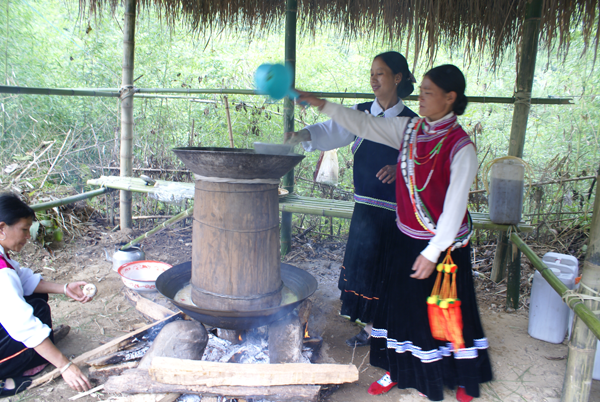 傈僳族一般居住在高山峽谷地帶。新中國(guó)成立前,生產(chǎn)力水平低下,人們往往早出晚歸,途中常常忍饑挨餓,而帶食物之類又不方便,于是,他們?cè)陂L(zhǎng)期的生產(chǎn)勞動(dòng)過(guò)程中知道吃干飯比稀飯耐饑,這樣,就形成了傈僳族以“干”為主的飲食習(xí)慣:如蒸玉米面,由于傈僳族人耕種的土地大都離村寨比較遠(yuǎn),需爬坡走箐,體力消耗大,勞動(dòng)歸來(lái)人們極想喝上幾口“飯湯”解渴、止餓,這樣,又形成了傈僳族以玉米稀飯為主的各種“稀”食輔之于“干”食的飲食習(xí)慣。新中國(guó)成立前,大部分傈僳族地區(qū)地多田少,主要糧食作物為玉米、旱谷、小麥、蕎麥、高粱等,這樣,傈僳族以玉米為主食,輔之以小麥、旱谷、蕎麥、大米等。副食有肉禽蛋類,但較少,主要還是上山獵取動(dòng)物輔之。蔬菜、水果種類也不多。