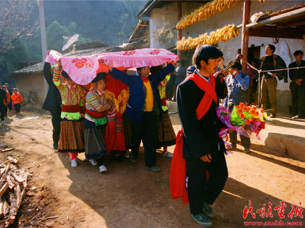 山歌你問我答,感情真摯動(dòng)人,讓在場人十分酸楚。不知不覺送親的時(shí)間到了,在主持人的催促下,依依不舍的女兒才叩拜父母、叩拜家神,在葫蘆笙手的領(lǐng)親曲中緩緩啟程。出堂屋跨門檻時(shí),舅母幫張正秀提起裙擺,其意是不讓新娘把娘家的財(cái)運(yùn)掃走。