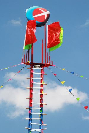 2011年,緬甸傈僳學(xué)會(huì)在密支那舉辦了第一屆世界傈僳闊時(shí)節(jié),第一次將十幾米高的弩弓木雕作為會(huì)徽。該木雕高高聳立于密支那郊區(qū)闊時(shí)節(jié)會(huì)場(chǎng),還有印有傈僳族徽的紅旗插滿會(huì)場(chǎng)四周,高高飄揚(yáng),與巨型木雕相互輝映,構(gòu)成了一個(gè)以弩弓木雕為核心,族徽紅旗環(huán)繞的闊時(shí)節(jié)會(huì)場(chǎng)空間。其內(nèi)其外,傈僳族空間與非傈僳族空間區(qū)隔明顯。