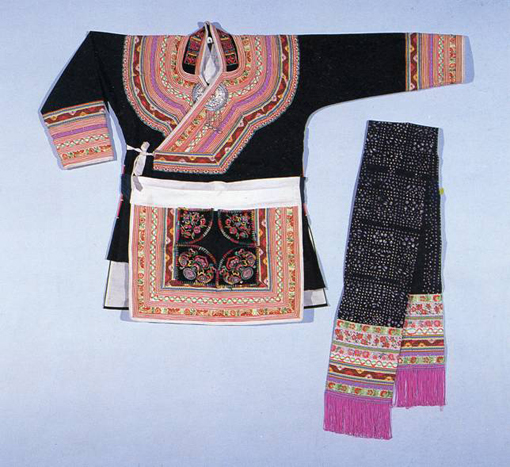 由于畬族長期與漢族雜居,現(xiàn)在畬族男子服裝與當(dāng)?shù)氐臐h族人基本沒有區(qū)別,閩浙一帶的畬族婦女還保留著明顯的傳統(tǒng)服飾特色。畬族婦女的服裝稱為“鳳凰裝”,上衣多為黑色大襟服,領(lǐng)高2~4厘米,兩旁開衩,后裾長于前裾,通身無扣,只在右衽襟角縫有兩條藍(lán)色、白色或紅色系帶,衣領(lǐng)、袖口及兩襟飾以紅、黃、綠、藍(lán)、黑五色花線繡成的各式花邊,有的花邊由衣領(lǐng)延伸至肩部和胸部,中青年婦女的服裝花多、花邊寬,老年婦女的服裝花少、邊紋窄。而居住在不同地區(qū)的畬族婦女,其鳳凰裝也略有差異,主要可分為福安式、福鼎式、霞浦式、羅連式、麗水式幾種。