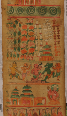 納西族東巴教的長(zhǎng)幅布卷畫(huà),通稱(chēng)為“神路圖”,它是東巴教繪畫(huà)中的巨作。此類(lèi)畫(huà)一般長(zhǎng)10-20米,寬1尺左右,有“古代宗教繪畫(huà)第一長(zhǎng)卷”之譽(yù)。文化內(nèi)涵異常豐富,在國(guó)際學(xué)術(shù)界被視為宗教繪畫(huà)一絕。如今,此畫(huà)已成稀有之物。很少見(jiàn)到尚留存民間的神路圖了?!吧衤贰敝鉃闁|巴為死者評(píng)斷、指點(diǎn)通往神地之路,把他們從地獄的煎熬中解脫超度出來(lái),轉(zhuǎn)生為人,送至神靈之地。在納西族的喪葬和超度亡靈儀式上,根據(jù)神路圖導(dǎo)引死者靈魂進(jìn)入新的生命場(chǎng)是一件極為重要的大事。到時(shí),要把神路圖展開(kāi),眾東巴站于圖旁依次詠誦8冊(cè)《神路圖經(jīng)》,為死者評(píng)斷路徑,導(dǎo)引亡靈穿越鬼地;擺脫惡鬼的種種折磨。在納西族實(shí)行傳統(tǒng)安葬習(xí)俗時(shí),要在安葬場(chǎng)鋪開(kāi)神路圖,把圖上的鬼地部分朝著死者頭部,向東北方向鋪開(kāi)。往東北方向鋪的意思是死者靈魂將回歸東北方向的納西遠(yuǎn)祖之地。把死者靈魂送到“祖先之地”是納西族的古代民俗。各地納西族都有十分詳細(xì)的送魂路線,靈魂返祖地必經(jīng)的每一個(gè)地名都在口傳和寫(xiě)于東巴經(jīng)的送魂路線中標(biāo)出。其畫(huà)面所繪鬼神人三界有數(shù)百個(gè)人神鬼獸的形象和很多具有宗教象征意義的物象,有佛像、神像、各種動(dòng)物神,七八十個(gè)奇禽異獸以及東巴跳神的舞蹈布局,畫(huà)卷內(nèi)容以靈魂不滅,因果報(bào)應(yīng),生死輪回等佛教信條為指導(dǎo),用連續(xù)性和富有戲劇性的畫(huà)面表現(xiàn)人死后亡魂不滅。