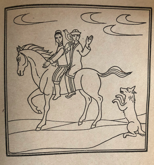 汗想坐得靠近那個美女一點(diǎn)兒,可是,他剛往前一湊,美女一下子變成了狼,上去把汗抓了個頭破血流,然后很快地跑掉了。狼又從后面趕上了少年和那位姑娘。少年又對狼說:“我也不想跟這匹馬分開了,能不能想個辦法呢?”狼說:“可以。”在回到第一個汗的附近時,狼又搖身一變,變成了一匹駿馬。少年牽著駿馬送到汗那里。汗回謝以后,就給了他那只金絲鳥。少年帶著金絲鳥和姑娘一起騎上馬又走了。