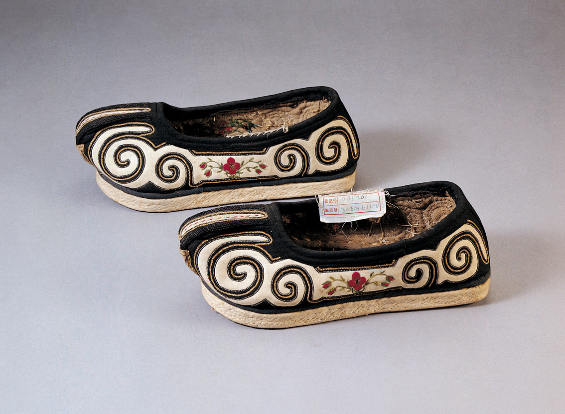 土族民國時期云紋雙梁繡花男布鞋,中央民族大學(xué)民族博物館館藏