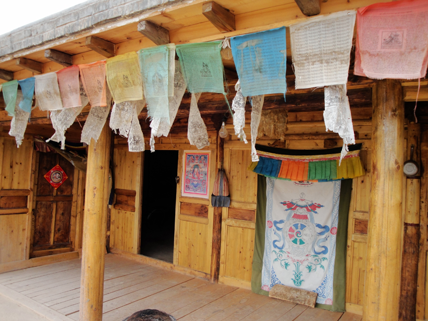 主房多用來(lái)供神,中堂擺一堆大紅面柜,上置吉祥箭、佛龕或其他供器。廚房鍋灶或案板上方為灶神之位。屋內(nèi)陳設(shè)家居有衣柜、貨架、面柜、沙炕、木板炕、打泥炕。有一種俗稱“鍋臺(tái)連炕”的打泥炕,土語(yǔ)稱“禿光”,是一種與鍋臺(tái)連在一起的土炕。土族人把廚房設(shè)在東房,鍋臺(tái)筑在居中的一間里,緊挨鍋臺(tái)(忌坐西向東)后面的一間房里盤上打泥炕。在灶與炕之間砌一堵矮土墻,叫“攔炕”,煙道經(jīng)過(guò)炕下后才能通往煙囪。平時(shí)做飯、燒水時(shí),余熱可使土炕變得暖烘烘的,可謂一舉兩得。平時(shí),炕上不鋪氈,上炕不脫鞋,一家老小都坐在炕上吃飯、休息。如果有客人來(lái),則要鋪上氈讓客人坐在上方。