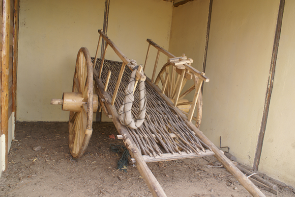達斡爾車,亦稱為大輪車或大轱轆車,用黑樺木和柞木制作,輪高約1.5米,車輞是黑樺木經(jīng)熏烤彎曲而成,兩到三根輞圈成一輪。車轂是用約40厘米長、30厘米直徑的黑樺木制成,上面安18到22根輻條。在軸和轂眼處安裝鐵制锏,以減少磨損。車轅約4米長,套馬、牛拉車,載重達千斤。