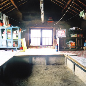 達(dá)斡爾族住房以兩間或三間居多,以西屋為上,不設(shè)北窗。東西兩屋的南面各有3扇窗戶,中間一間在房門兩側(cè)各有一扇窗戶,西屋開兩扇西窗,更利于采光和通風(fēng),這在北方民居中比較少見。兩間房的西屋是起居室,南、西、北三面連炕,成“凹”字形,與滿族的“萬字炕”差不多。近些年,達(dá)斡爾族家庭人口少了,特別是結(jié)婚的新房只搭北炕,南面放置組合家具和冰箱、洗衣機(jī)。東屋開南門,作為廚房,砌鍋灶,一般用8印或10印的鐵鍋。煙囪在墻外,與房頂有距離,有的用草垡子壘砌,有的用木板,這樣的煙囪不僅抽力大,灶堂好燒,而且可以避免草房頂?shù)幕馂?zāi)。近十幾年建的房子,煙囪都在西山墻上用磚壘砌,一直伸出屋脊后坡,高出房頂一米多。