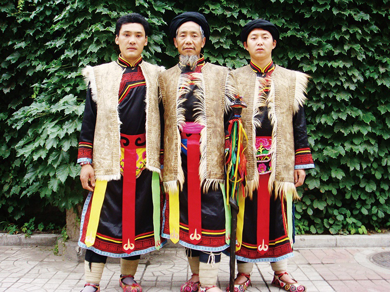 圖片左為楊俊清,中為老釋比朱金龍(楊俊清的老師),右為余正國(原是一名當?shù)氐那颊Z老師)。他們是當?shù)赜忻尼尡取? 梁黎2008年攝于北京