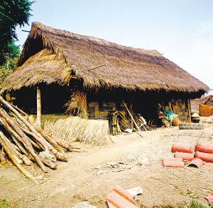 臨滄地區(qū)的耿馬縣芒洪鄉(xiāng)也是布朗族的聚居區(qū)。房屋以草頂居多,也有蓋竹瓦的。三開間居多,門在正中,左邊是火塘,是就餐待客和睡覺(jué)的地方,右邊放糧食雜物。房屋為木柱結(jié)構(gòu),縱向框架。大柱立于兩山墻中間,柱腳深埋地下,柱高依屋脊高度而定,柱頂以天然枝杈承托脊檁。以同樣的方法在四角各立頂端帶枝杈的柱子,柱高以屋檐的高度而定,承托邊檁。這樣6根木柱、3根檁木構(gòu)成了主要承重的縱向框架,也形成了雙斜面屋頂。在大柱間密栽小柱,小柱間再橫向綁扎竹片,從地面到柱頂形成密密麻麻的小方格子,這就是墻壁的骨架。然后把和了黃泥漿的長(zhǎng)草把一綹綹、均勻地掛到竹片上,將里外抹平,干后就成了“掛”著的草泥墻。