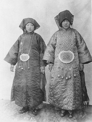 這是美國傳教士畢敬士影集中收錄的卡特·霍頓拍攝的又一張和撒拉族新娘有關的照片,此片也攝于青海循化。照片中的兩位撒拉族姑娘穿著鮮艷漂亮的衣服和翹尖的繡花鞋,佩戴著銀制的胸飾、墜子、項鏈、耳環(huán)和頭飾等。