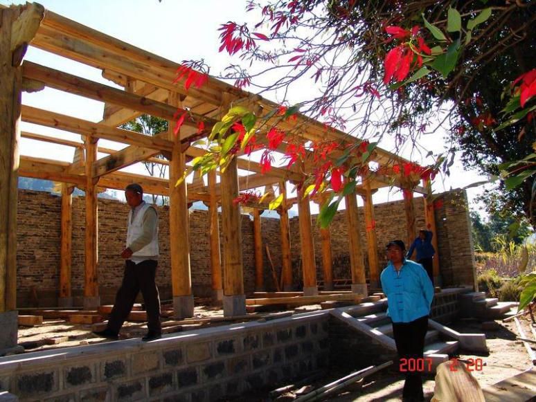 阿昌族建房傳統(tǒng)用工多是相互幫忙,全村協(xié)作,只吃飯而不付酬。建房一般分為“選材備料”“看風(fēng)水擇房基”“動土奠基” “立柱成屋”等幾大程序。