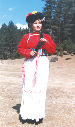 寧蒗地區(qū)的普米婦女多穿束腰、多褶的百褶裙,常用白藍(lán)等色的棉麻布制成,裙長幾乎拖至腳面。活動(dòng)時(shí),她們將裙子從左面提起,掖在腰間?! ?/p>