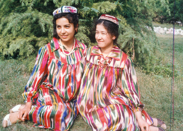 烏孜別克族女性喜愛(ài)穿連衣花裙,開(kāi)領(lǐng),寬大多褶,不束腰帶。上衣比較短,只及大腿部,無(wú)領(lǐng)、無(wú)袖、對(duì)襟,下擺的正中和正面兩邊都開(kāi)衩,形成兩片寬帶。襟和寬帶的邊都繡花。出門(mén)時(shí)還要穿斗篷、蒙面紗,從頭到腳都不能外露。