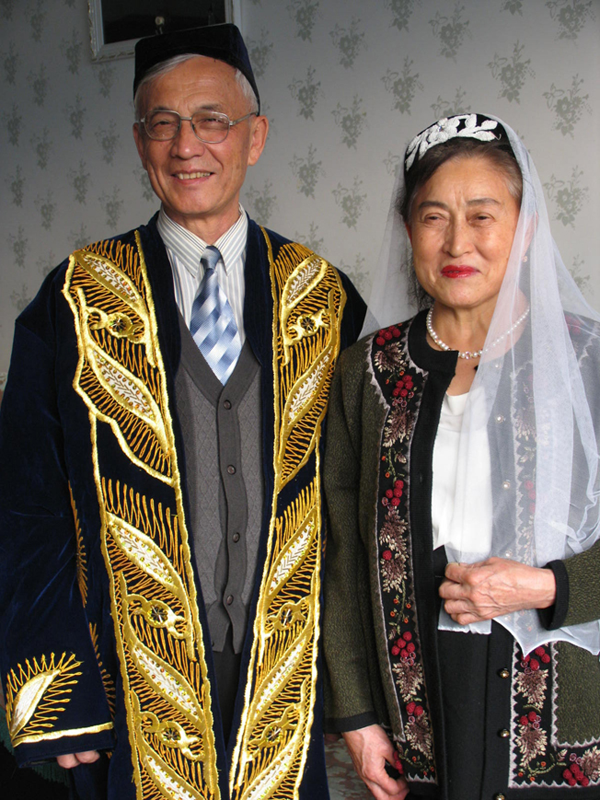 烏孜別克族男子的傳統(tǒng)服裝是一種長(zhǎng)度過(guò)膝的長(zhǎng)衣,長(zhǎng)衣有兩種款式,一種為直領(lǐng)、開(kāi)襟、無(wú)衽,在門(mén)襟、領(lǐng)邊、袖口上繡花邊。信服上有花色圖案,十分美觀;另一種為斜領(lǐng)、右衽的長(zhǎng)衣,類(lèi)似維吾爾族的“袷袢”。腰束三角形的繡花腰帶,一般年輕人的腰帶色彩都很艷麗,所穿領(lǐng)邊、袖口、前襟開(kāi)口處都繡著紅、綠、藍(lán)相間的彩色花邊圖案,表現(xiàn)了烏孜別克族工藝美術(shù)的特點(diǎn)。老年人卻愛(ài)穿黑色長(zhǎng)衣,腰帶的顏色也偏于淡雅。烏孜別克男女傳統(tǒng)上都愛(ài)穿皮靴、皮鞋,長(zhǎng)靴外面還常穿膠制淺口套鞋,進(jìn)屋時(shí)脫下套鞋,就可以不把泥土帶進(jìn)屋內(nèi),十分衛(wèi)生。