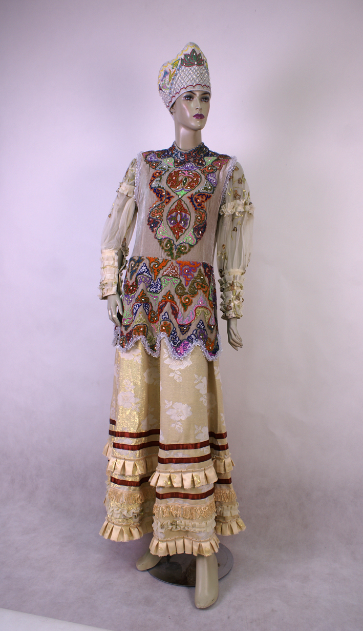俄羅斯族女性的服飾則更多的體現(xiàn)了女性美,她們在重大節(jié)慶或節(jié)日時會穿上絲綢質地的繡花襯衣,外面再套穿一件無袖、腰身較高的對襟長衫,下身一般穿著毛織長裙。俄羅斯族女子也十分喜愛穿長筒皮靴或氈靴。俄羅斯族女性的發(fā)飾也視年齡的不同而有所差異,少女梳獨辮,把彩色發(fā)帶和小玻璃球編在辮子里,頭發(fā)可外露。已婚婦女則梳兩條辮子,盤于頭頂,再用頭巾或帽子罩上。