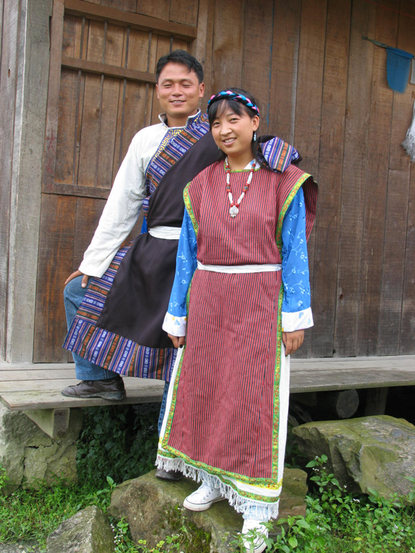 門(mén)隅地區(qū)的男女都喜愛(ài)用羊毛織品氆氌為原料,穿氆氌袍和絳紅色的長(zhǎng)袍,腰間系一條赭色腰帶;女子內(nèi)衣以棉織和蠶織品做原料,顏色絢麗多樣,無(wú)開(kāi)襟、無(wú)領(lǐng)、無(wú)扣子,只開(kāi)一個(gè)圓口或三角口由頭套穿。外加長(zhǎng)袍及上身穿黑氆氌做的“熱故”(門(mén)巴語(yǔ),留有邊子的短服),下身腰部圍一塊白氆氌做的“吉瑪”(門(mén)巴語(yǔ),圍裙)圍裙,并在圍裙右下角綴有“雍仲”(藏語(yǔ),意為堅(jiān)固、永固。原始宗教苯教奉為神秘字,并以左旋逆時(shí)針?lè)较蛑巫旨y作為代表)吉祥圖案,有的繡有“日月吉祥”圖案。